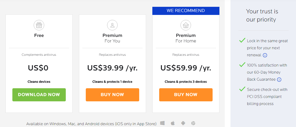 - Premium For Home – goes for $59.99 per year, billed every 12 months. According to Malwarebytes, this is the most recommended package, considering you can clean ad protect up to three devices simultaneously.