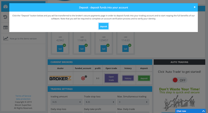 Once you have finished the registration process, you will be redirected to Bitcoin Superstar trading dashboard where you can manage your trading settings and account. Whenever you feel ready to start trading, click on the deposit button and you will be transferred to the broker’s deposit page. Bitcoin Superstar has a minimum deposit requirement of $250.
